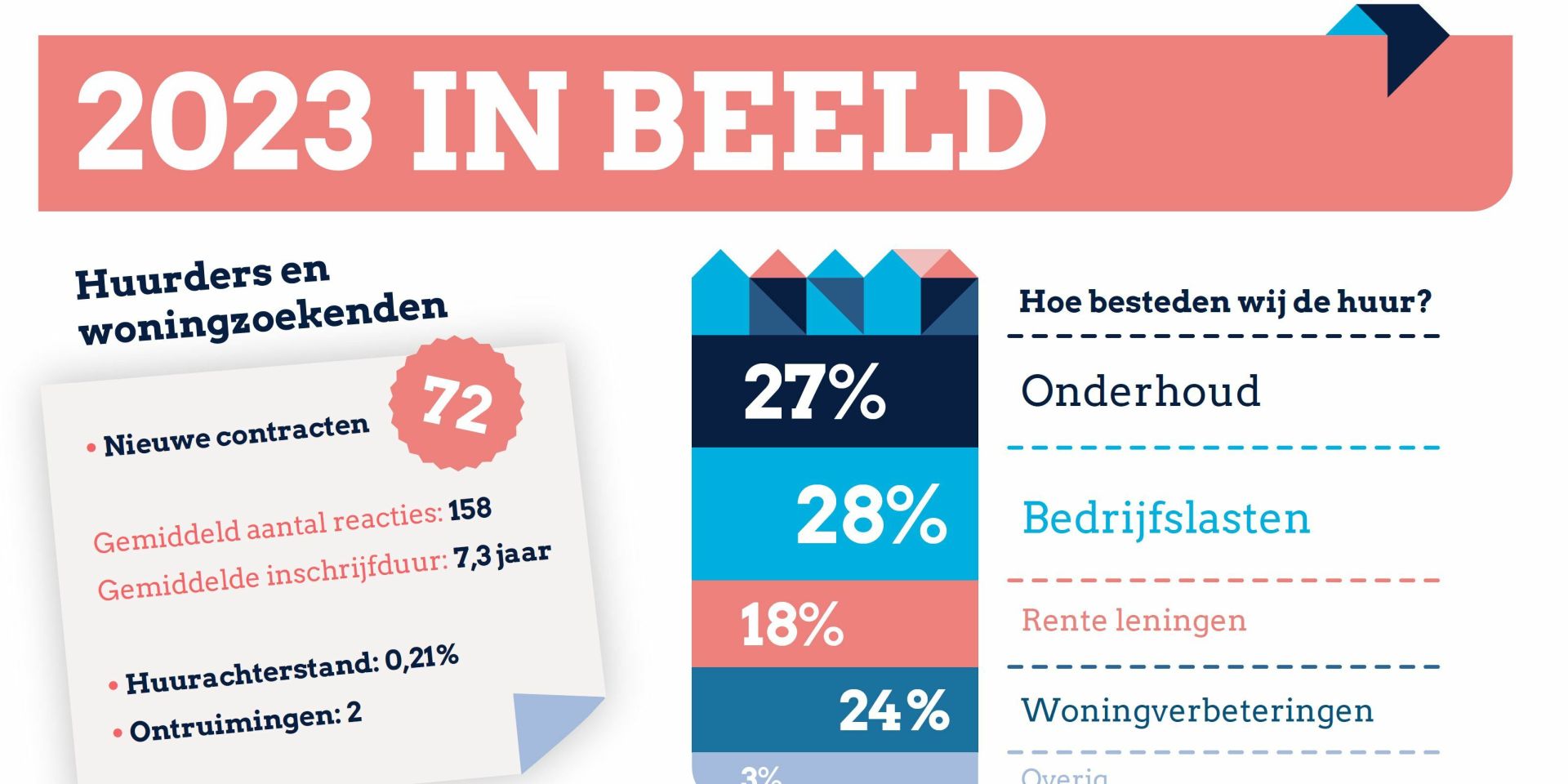 In het jaar dat achter ons ligt, renoveerden we 23 woningen, gaven we ruim 3 miljoen euro uit aan onderhoud en verbeteringen en kregen we van onze huurders een mooie A-score in de Aedes-benchmark. Dit en nog veel meer lees je in ons jaarverslag.